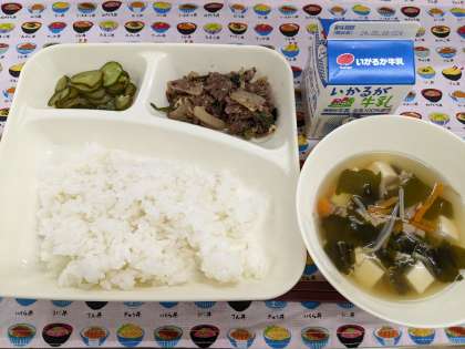 5月2日(木)の給食は「プルコギ、とうふとわかめのスープ、きゅうりの甘酢づけ、ごはん、牛乳」です。