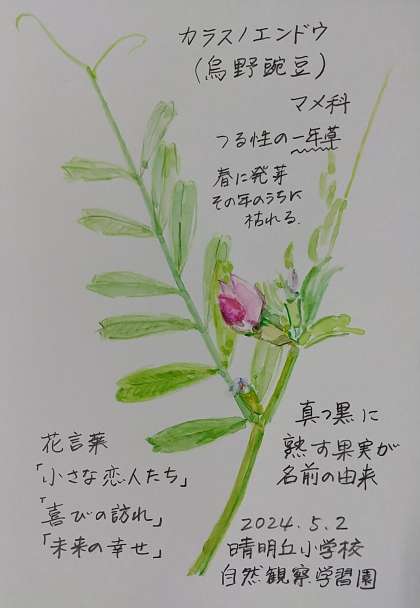 実は、絹さやの小さいような形ですが、熟すと真っ黒になることから「カラスノエンドウ」と名付けられた。