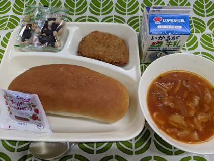 5月7日(木)の給食は「一口トンカツ、ミネストローネ、豆こんぶ、コッペパン、いちごジャム、牛乳」です。