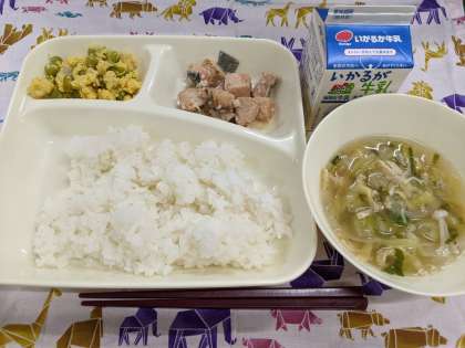 5月9日(木)の給食は「さけのごまみそ焼き、五目汁、えんどうの卵とじ、ごはん、牛乳」です。