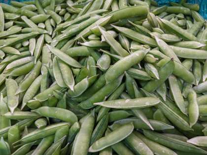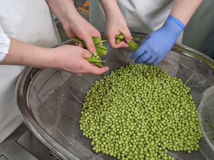 えんどうの卵とじは今の季節だけ味わえる、旬の生のえんどうを使ったこんだてです。さや付きのえんどうを、給食室でひとつずつむいています。鶏肉といっしょにだしで煮て、卵でとじ、食べやすく仕上げています。