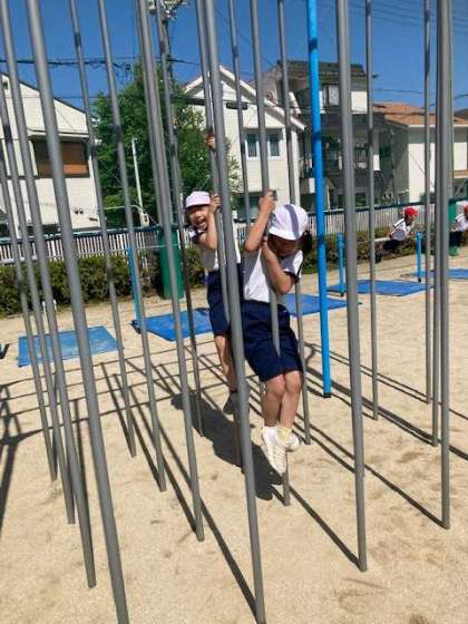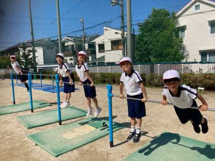 鉄棒では握り方から始め、ぶら下がったりしました。