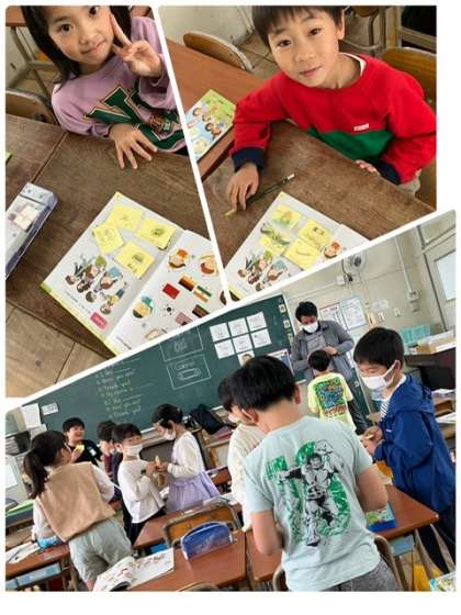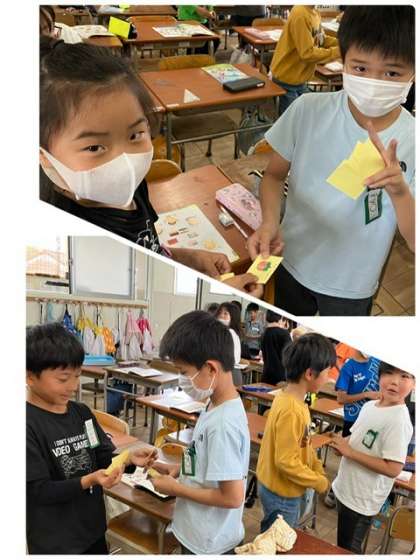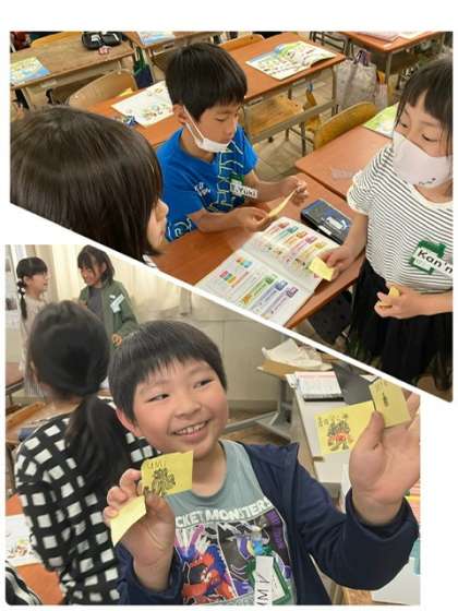 自分の名前の下に好きな物の絵をかいた名刺をつくり、英語であいさつをしながら名刺交換会をしました。