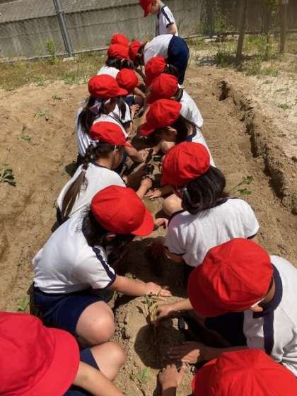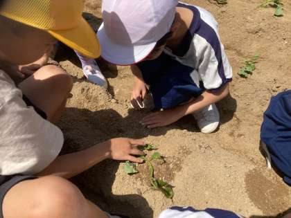 トマトの苗との違いを見つけて観察し、畑に植えました。