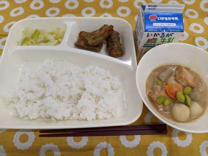 5月23日(木)の給食は「ちくわのいそべあげ、鶏肉とさといものみそ煮、きあっさりキャベツ、ごはん、牛乳」です。