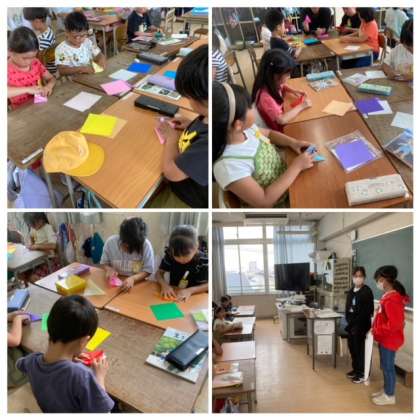 六年生が修学旅行に行くので、千羽鶴の作り方を教えてもらいました。得意な子は苦手な子に教えながら和気藹々と作りました。