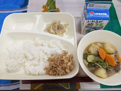 5月27日(金)の給食は「みそ肉じゃが、もやしの甘酢あえ、ごまかかいため、ごはん、牛乳」です。