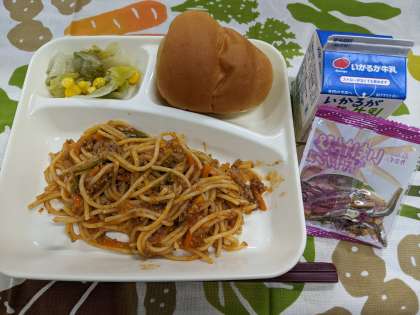 5月28日(金)の給食は「ミートソーススパゲッティ、レタスとコーンのサラダ、いもけんぴフィッシュ、ミニコッペパン、牛乳」です。