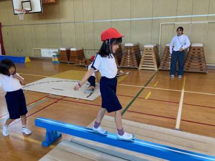 前回りをしたり、平均台でバランスをとったり、友だちと一緒に転がったりと楽しみながら体を動かしました。