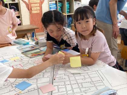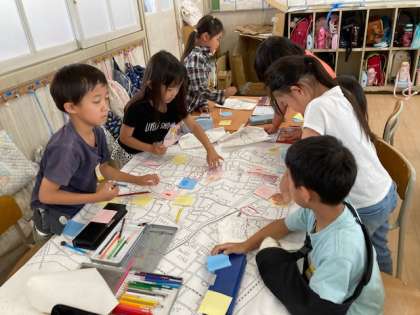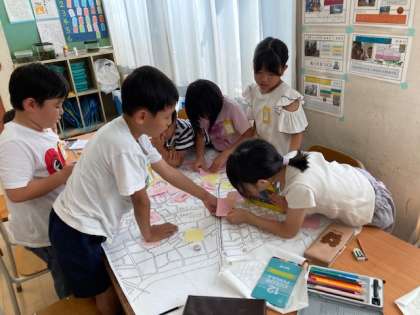 「ここにはパン屋さんがあったよ」「アジサイが咲いてた!」「郵便局は黄色の付箋で貼るよ!」とグループで話し合いながら進めていきました。