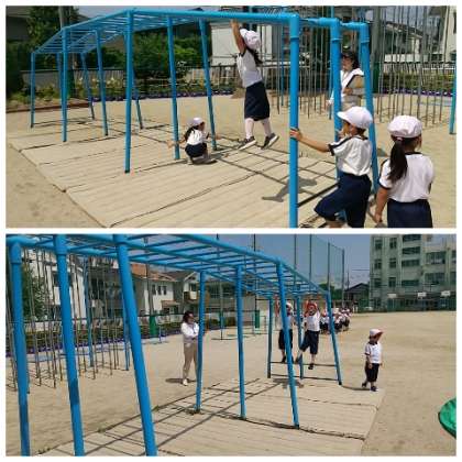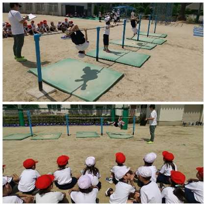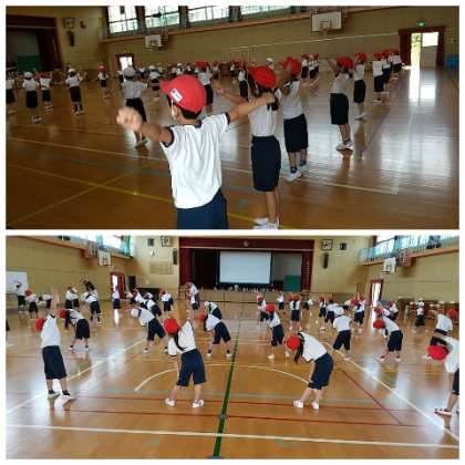 1年生が、2クラスずつ体育館と運動場に分かれて体育の学習をしています。