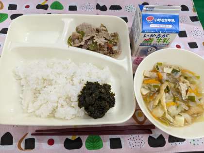 6月12日(水)の給食は「豚肉の梅風味焼き、五目汁、のりのつくだ煮、ごはん、牛乳」です。