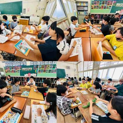 班で、音楽が流れている間に筆箱を回すゲームをしました。