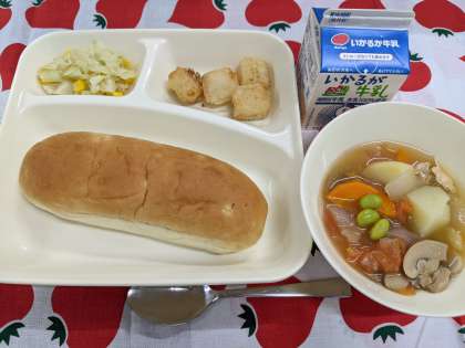 6月14日(金)の給食は「いかてんぷら、フレッシュトマトのスープ煮、キャベツとコーンのサラダ、おさつパン、牛乳」です。