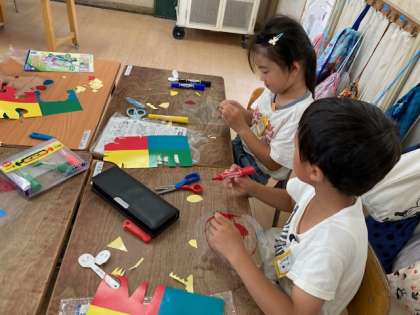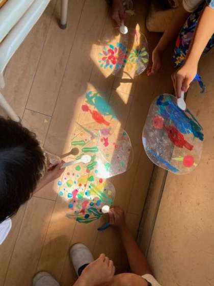 プラスチック板にセロファンやマーカーで色をつけて、日光に当たると透き通るうちわを作りました。