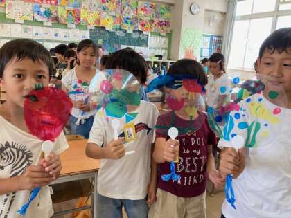 暑い日が続くので、うちわは夏をイメージして海や太陽などを表現しました。