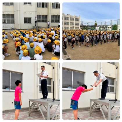 次に、陸上大会の表彰式をしました。6年生の男の子が校長先生から賞状をもらいました。周りの子どもたちから大きな拍手をもらいました。とてもよく頑張ったと思います。