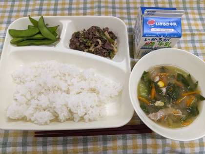 6月17日(月)の給食は「チンジャオニューロウスー、中華みそスープ、えだまめ、ごはん、牛乳」です。