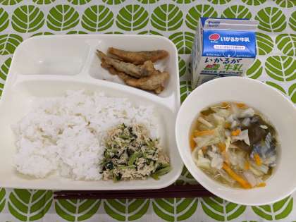 6月19日(水)の給食は「いわしてんぷら、五目汁、鶏なっはいため、ごはん、牛乳」です。