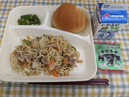 6月21日(金)の給食は「和風焼きそば、オクラの甘酢あえ、ソフト黒豆、ミニコッペパン、牛乳」です。