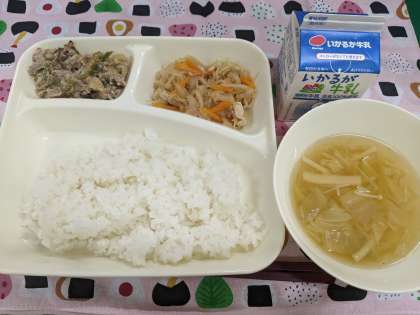 6月24日(月)の給食は「豚肉のごまみそ焼き、すまし汁、切干しだいこんのいため煮、ごはん、牛乳」です。