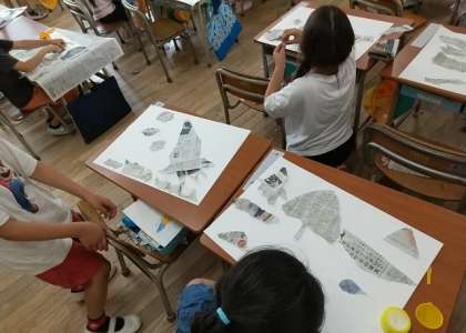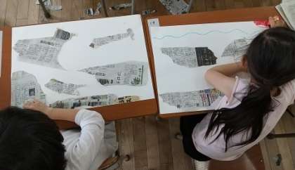 1年生の子どもたちは、ビリビリと紙を破く感触を楽しみながら、思い思いの形に紙の形を変えていきます。
