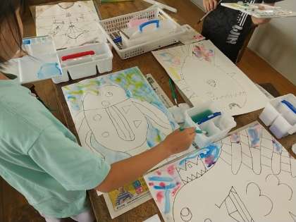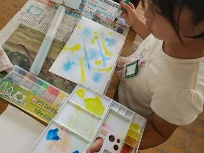 絵の具の「にじみ表現」を生かして、絵の具の広がり方をためしながら楽しんで表現しています。