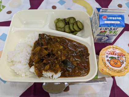 7月3日(水)の給食は「夏野菜のカレーライス、きゅうりのサラダ、みかんゼリー、牛乳」です。