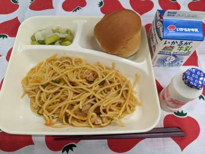 7月9日(火)の給食は「チキントマトスパゲッティ、グリーンアスパラガスとキャベツのサラダ、発酵乳、ミニコッペパン、牛乳」です。