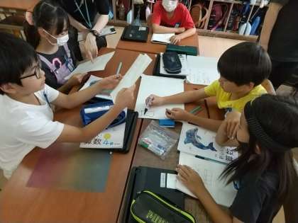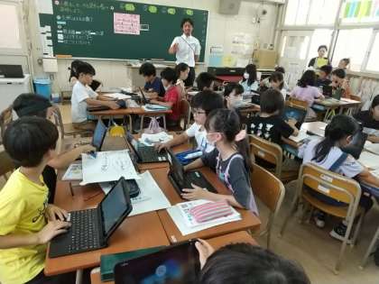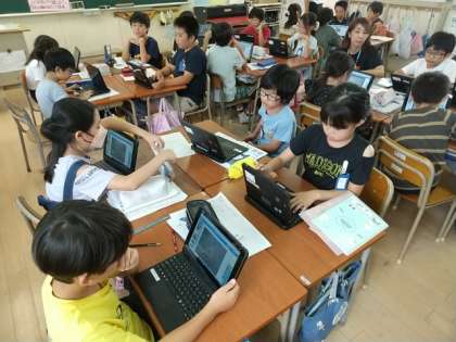 小数のしくみについて、自分なりの考えの見通しを持ち、互いの考えを説明しあっていました。班での話し合った内容をタブレットに保存し、学級全体で班ごとで話し合ったことを交流していきます。