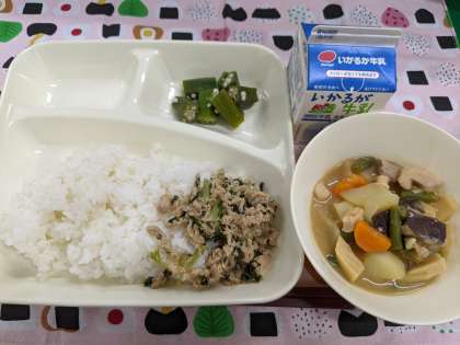 7月11日(木)の給食は「鶏肉と野菜のみそ煮、オクラの梅風味、ツナっ葉いため、ごはん、牛乳」です。