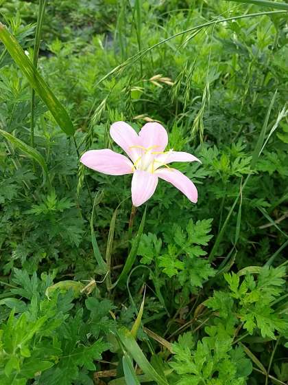 ヨモギやイヌムギの濃い緑の中で、薄桃色の花一輪が目立っていた。