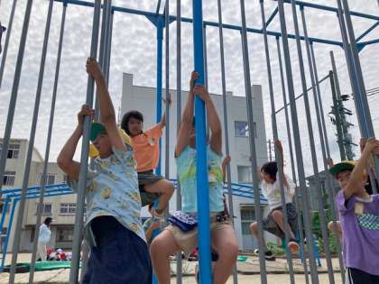 トマトの様子を見た後は、みんなで登り棒で競争していました。