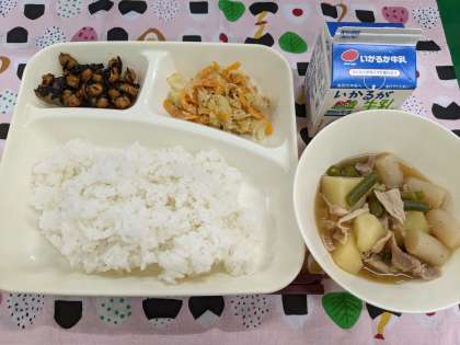 7月18日(木)の給食は「豚肉とじゃがいもの煮もの、ひじき豆、ささみと野菜のごまみそ焼き、ごはん、牛乳」です。