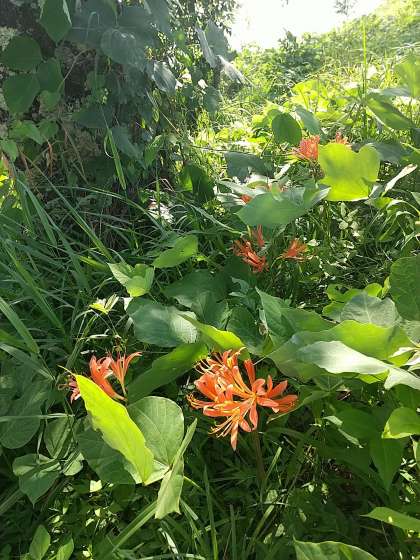 鮮やかな茜色の花が桜の木陰で咲いていた。