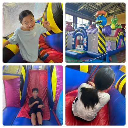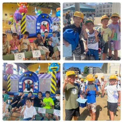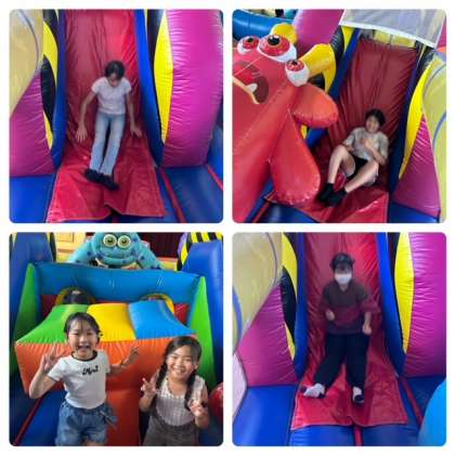 体育館では、今年度初めてエア遊具を設置しました。たくさんの子どもたちが使えるように、1回3分間の利用時間ですが、ルールを守って安全に楽しんでいました。滑り台はとてもよく滑るようです!