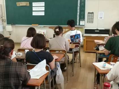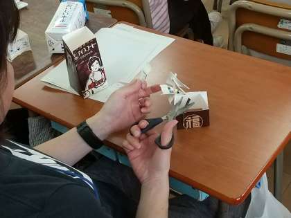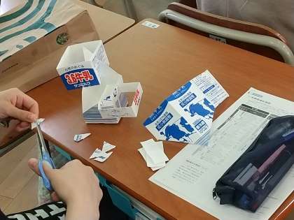先生たちが、図画工作の研修で紙パックを切り開き組み合わせています。