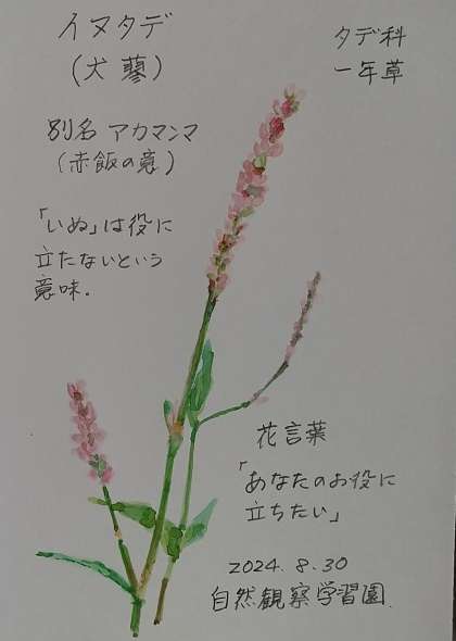 タデの仲間でもヤナギタデは、葉がとても辛く、刺身のつまに使われる。イヌタデの葉は、辛みがないことから役に立たないと・・・。