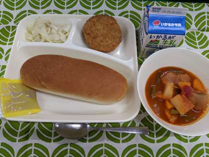 9月2日(月)の給食は「チキンレバーカツ、ケチャップ煮、キャベツのバジル風味サラダ、コッペパン、アプリコットジャム、牛乳」です。