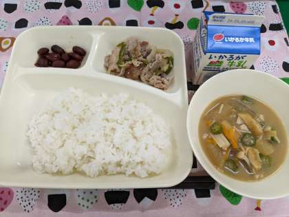 9月3日(火)の給食は「豚肉の甘辛焼き、とうがんのみそ汁、金時豆の煮もの、ごはん、牛乳」です。