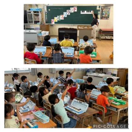 1組の子どもたちは、鍵盤ハーモニカを使った音楽科の学習です。指をチョキにして黒鍵を押さえ、位置を確かめたり、「ド」音が出る白鍵を探したりしていました。