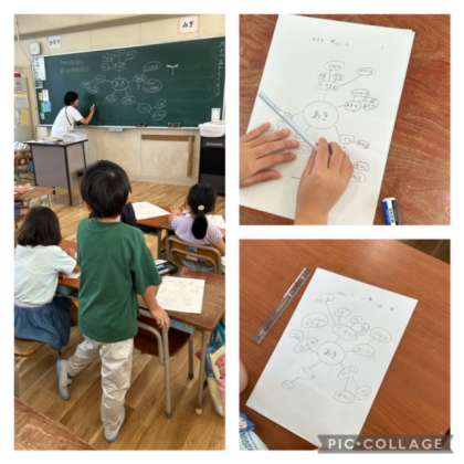 2組の子どもたちは、秋を想像していました。用紙に「あき」から連想するものをたくさん考えて、発表していました。