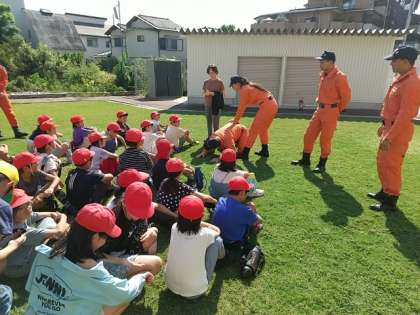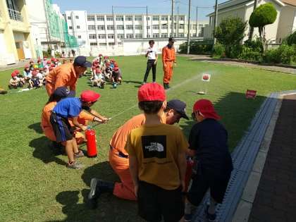 海外から救急救助技術研修に訪れている方々が、晴明丘小学校の4年生に、消火や救助の指導をしてくださいました。