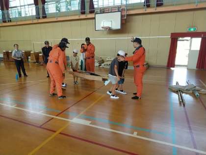 研修カリキュラムの中に子どもたちへの消火・救助訓練指導も含まれており、晴明丘小学校の4年生が協力しました。
