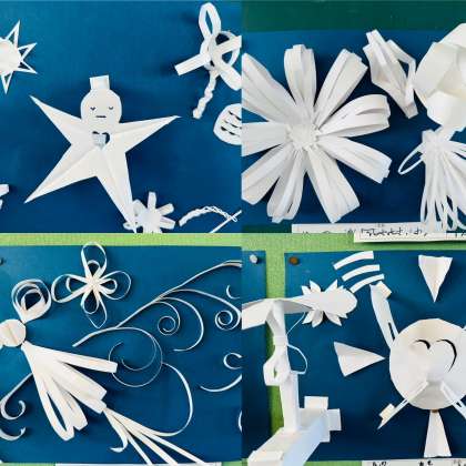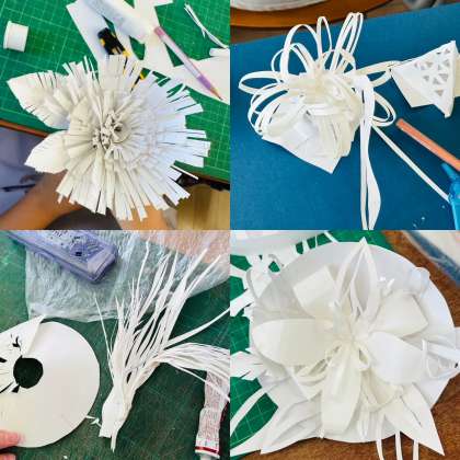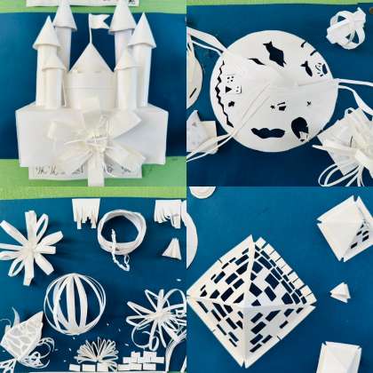 子ども達は、「こんなイメージにしたいんだけど、まずどんな風に切ろう?」「それ、どうやって貼り付けたん?」と、お互いに話し合いながら取り組んでいました。