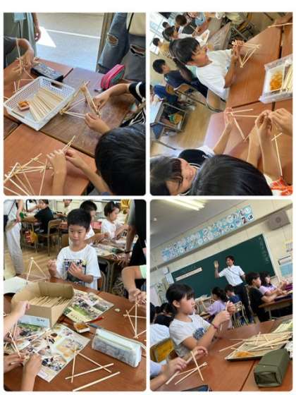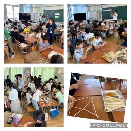 4年生は、図画工作科で割り箸を使って、輪ゴムでつなぎ、自分の表したい形を表現していきました。見たことのないような新しい形や、まるでお家のような形など、楽しそうに取り組んでいました。