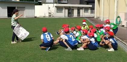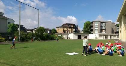 5年生は今、ベースボール型のゲームをしていますが、ボールの投げ方やキャッチの仕方について、先生から説明を受けていました。