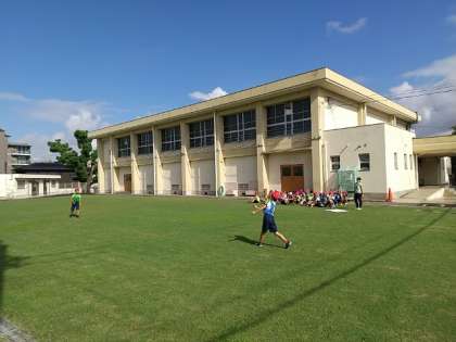 朝方に降った雨で運動場はぬれていますが、西運動場(芝生広場)は使える状態です。