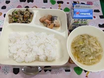 9月18日(水)の給食は「さけのつけ焼き、五目汁、高野どうふのいり煮、ごはん、牛乳」です。