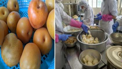 旬のなしは、給食では年1回登場します。二十世紀梨と豊水が1年おきに登場していて、今年は豊水です。豊水は皮の色が褐色の「赤梨」で、果汁が多く、甘みと、ほど良い酸味があります。丸みがあり全体がほどよく赤みがかっていて果皮に張りがあるものを選ぶとよいです。